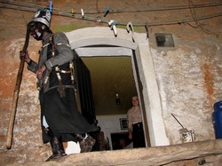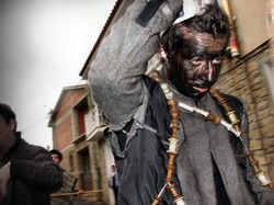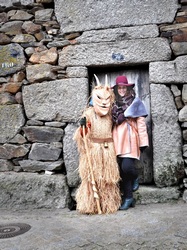"Carocho" com uma máscara de couro, um rosário de carretos de linhas — já vazios — pelo pescoço e um enorme garfo de madeira que há-de recolher os salpicões ou fazer tropeçar as raparigas da aldeia.
