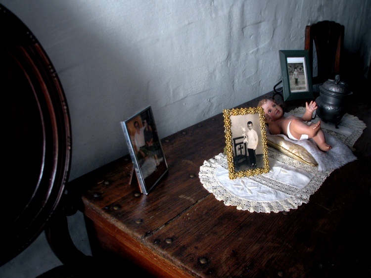 decorados com panos de linho bordado à mão e rematados por uma coroa com a pomba