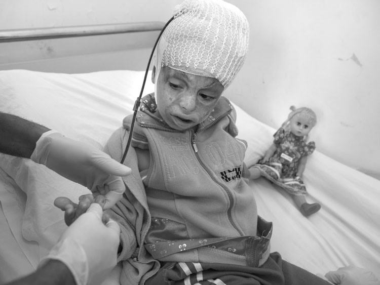 Malak, de 9 anos, foi ferido num atentado numa estrada de Kirkuk. As queimaduras desfizeram-lhe os dedos das mãos.