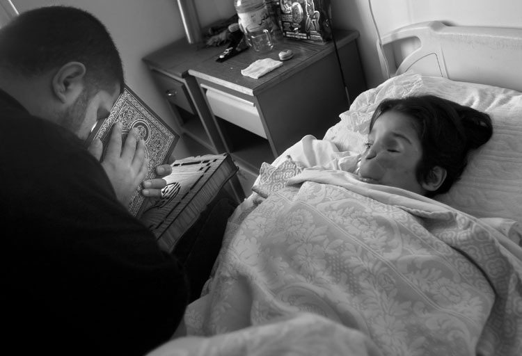 O pai do pequeno Abdullah lê uma passagem do Corão antes de mais uma intervenção cirúrgica.